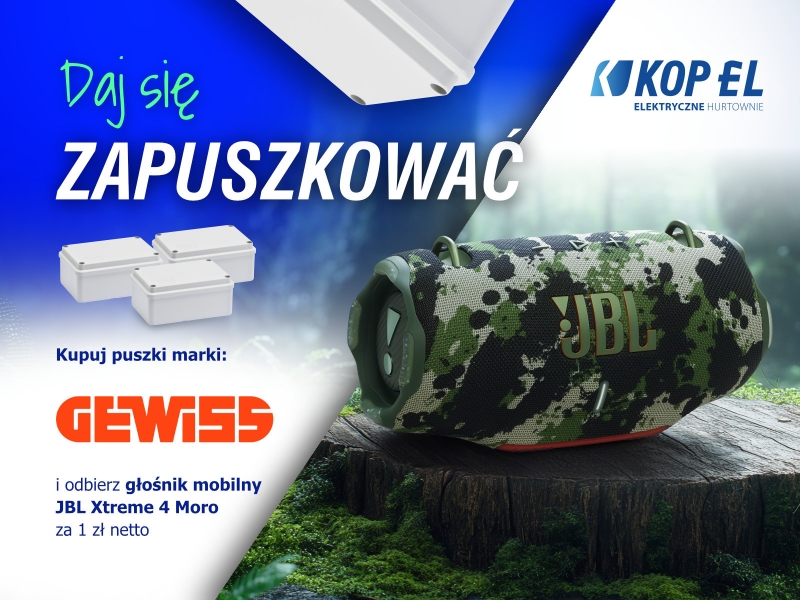 Zachęcamy do udziału w promocji współorganizowanej z firmą GEWISS pn. "Daj się zapuszkować", w której do wygrania są głośniki mobilne JBL Xtreme 4 za 1 zł netto. Aby zdobyć jeden z nich, należy w okresie promocji zakupić puszki instalacyjne GEWISS o wartości min. 4000 zł netto.