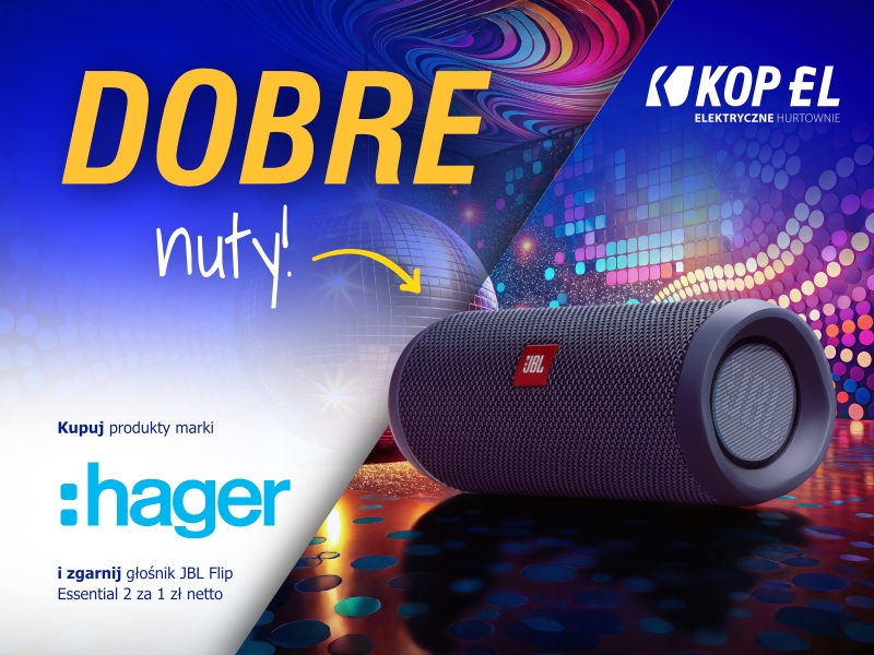 Zapraszamy do udziału w promocji współorganizowanej z firmą Hager pn. "Dobre nuty", w której do zdobycia są głośniki bezprzewodowe JBL Flip Essential 2 za 1 zł netto. Aby zdobyć jeden z nich należy zakupić dowolne produkty Hager o wartości min. 10 000 zł netto w okresie trwania promocji.